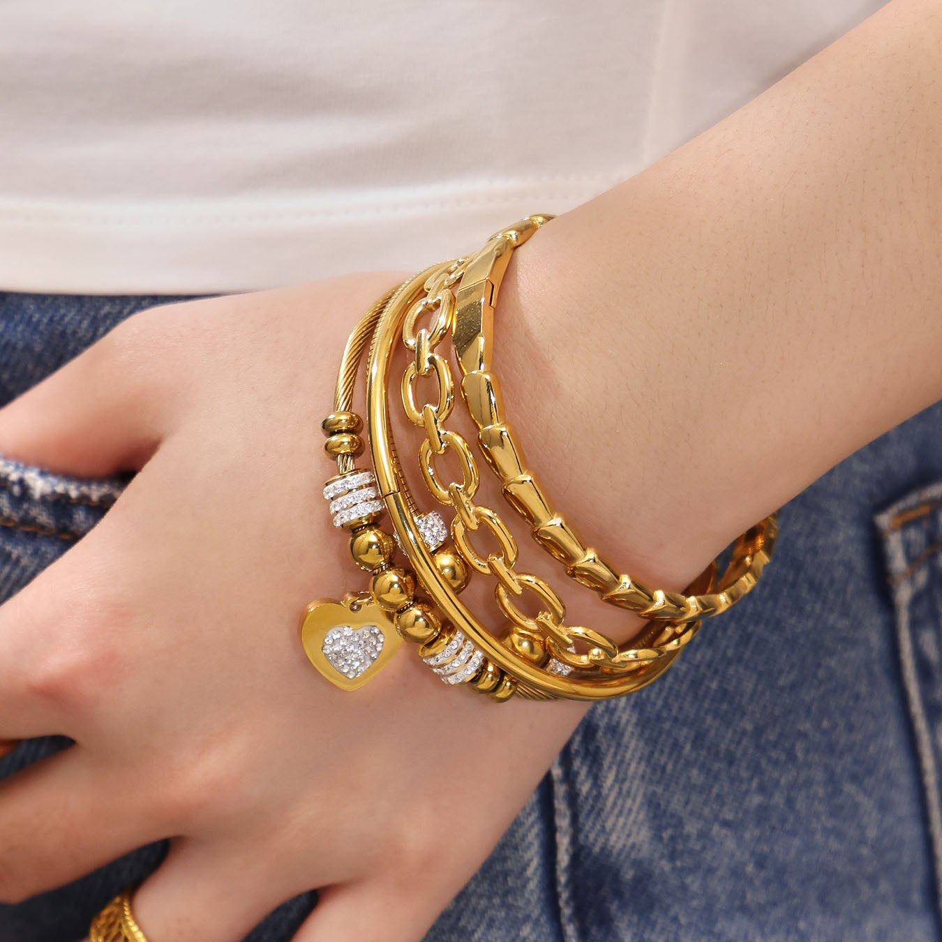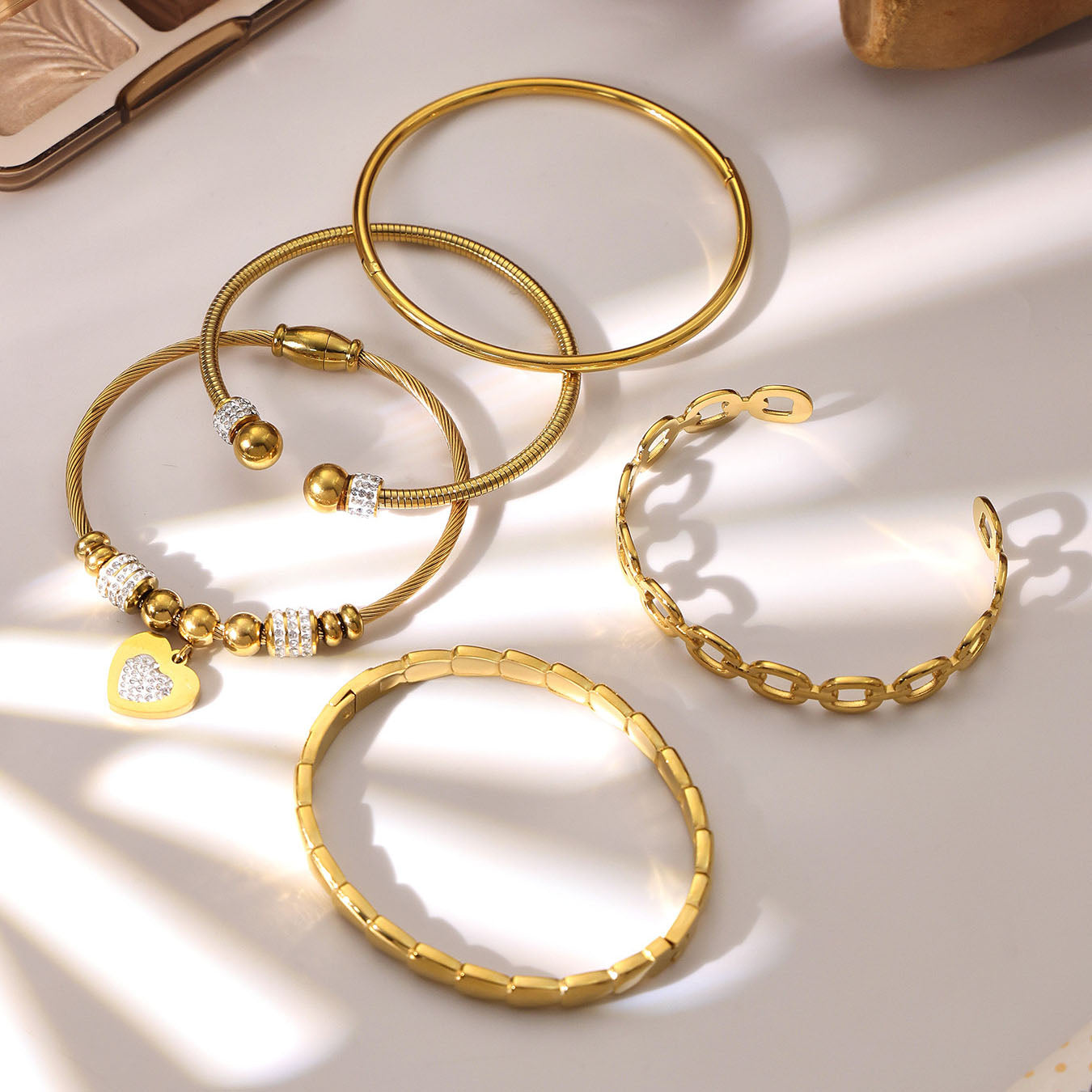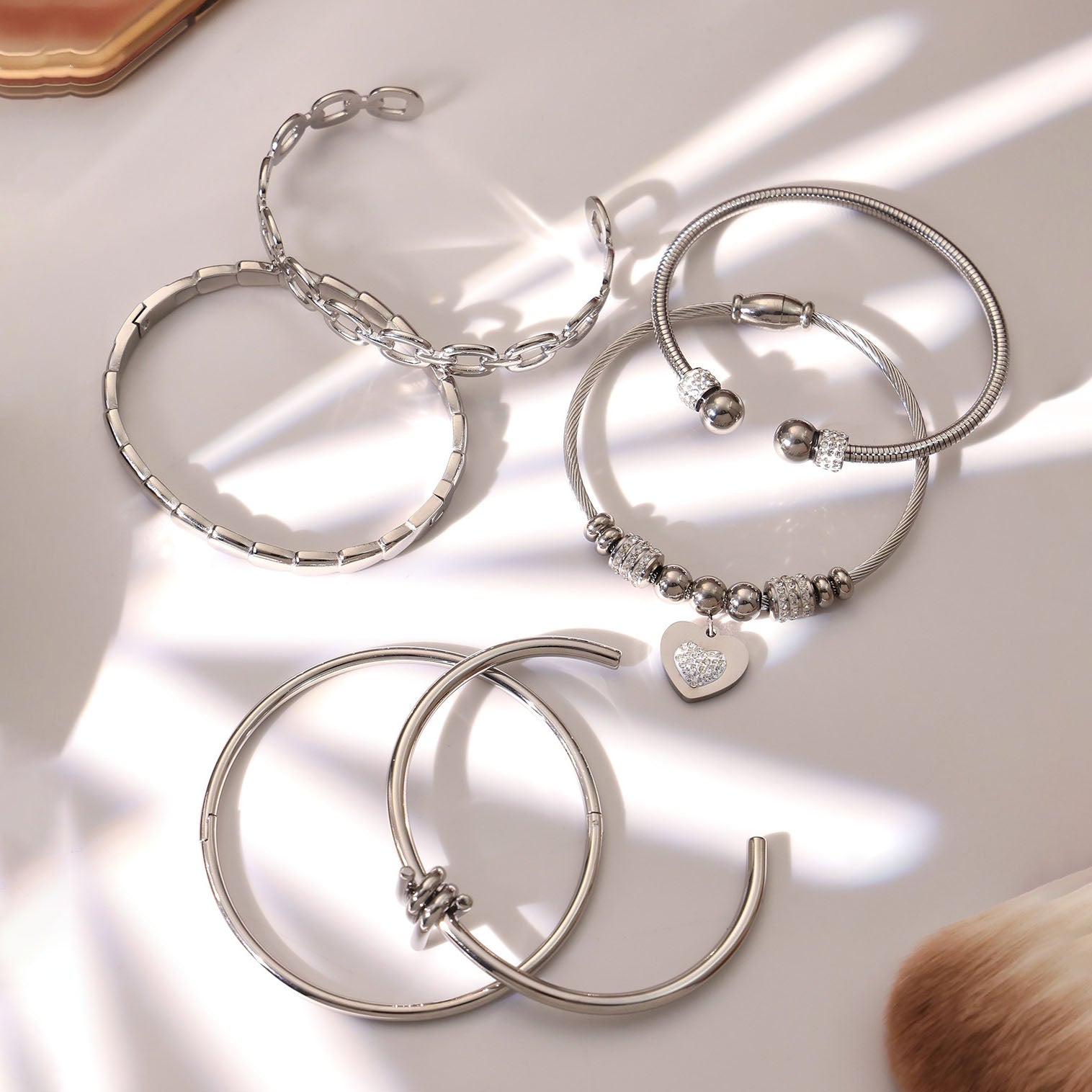 Verleihen Sie Ihrem Look mit unserem exquisiten Armband-Set in verschiedenen Stilen das gewisse Etwas. Die sorgfältig zusammengestellte Kollektion aus hochwertigem Edelstahl mit strahlendem Silber- oder 18-Karat-Gold-Finish umfasst fünf einzigartige Designs: einen romantischen Herzanhänger, ein elegantes Armband mit gedrehtem Kabelmuster, eine markante Gliederkette und minimalistische, polierte Armreifen. Die vielseitigen, robusten und hypoallergenen Schmuckstücke können einzeln für einen dezenten Hauch von Klasse oder kombiniert für einen atemberaubenden Look getragen werden. Das perfekte Geschenk für die moderne Frau, die mühelosen Luxus liebt.