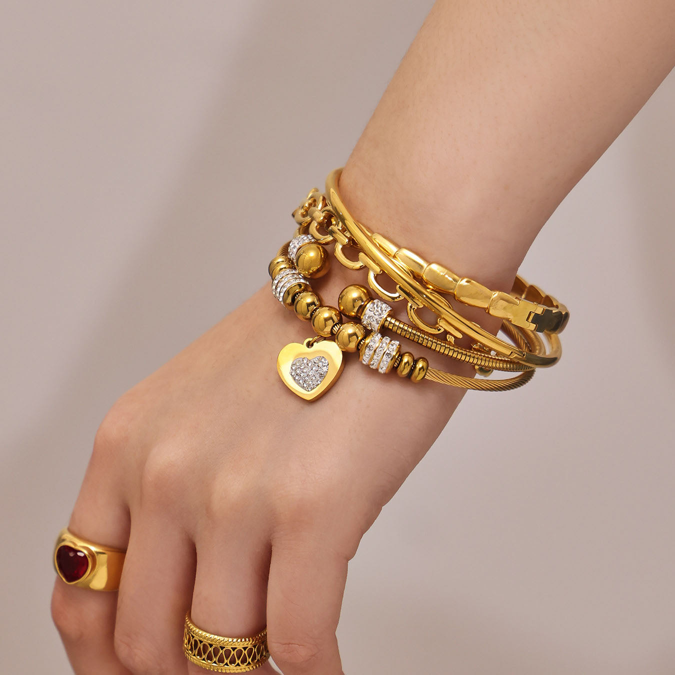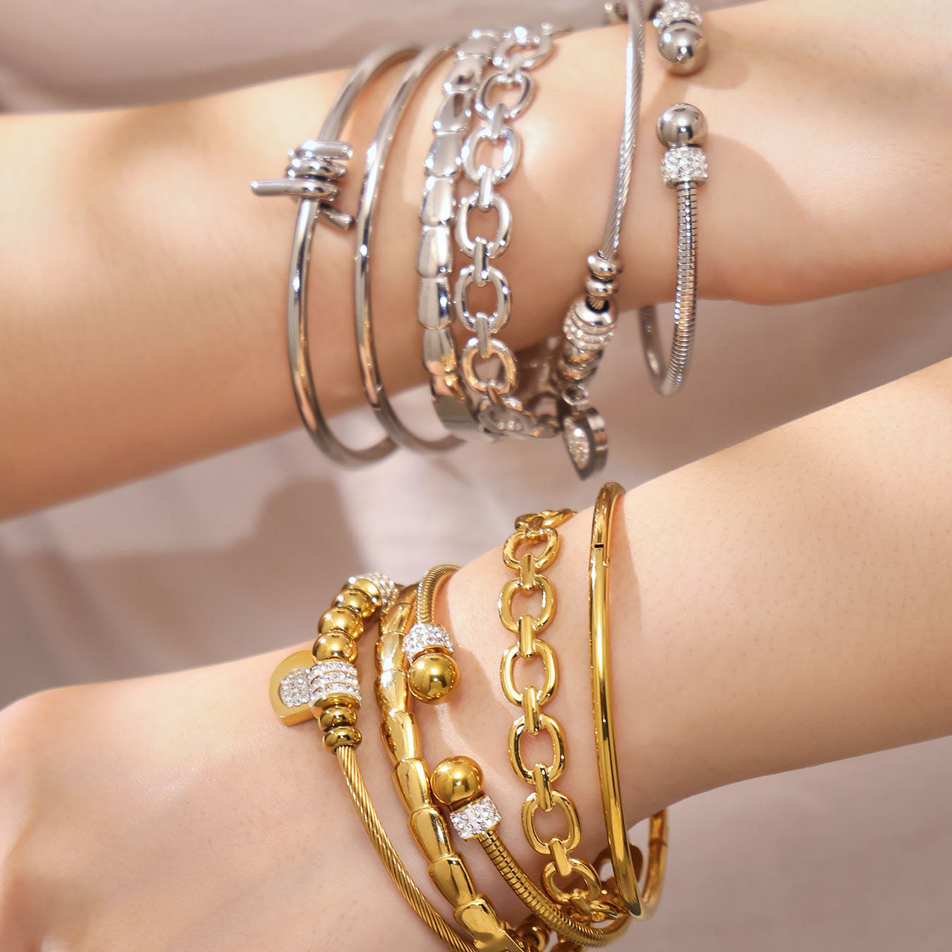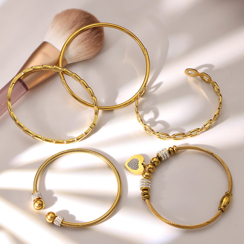 Verleihen Sie Ihrem Look mit unserem exquisiten Armband-Set in verschiedenen Stilen das gewisse Etwas. Die sorgfältig zusammengestellte Kollektion aus hochwertigem Edelstahl mit strahlendem Silber- oder 18-Karat-Gold-Finish umfasst fünf einzigartige Designs: einen romantischen Herzanhänger, ein elegantes Armband mit gedrehtem Kabelmuster, eine markante Gliederkette und minimalistische, polierte Armreifen. Die vielseitigen, robusten und hypoallergenen Schmuckstücke können einzeln für einen dezenten Hauch von Klasse oder kombiniert für einen atemberaubenden Look getragen werden. Das perfekte Geschenk für die moderne Frau, die mühelosen Luxus liebt.