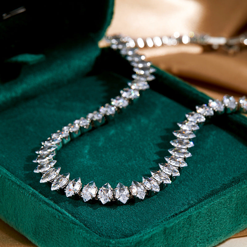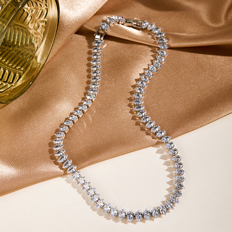 Gönnen Sie sich zeitlose Brillanz mit unserer eleganten Tennis-Halskette mit Marquise-Kristallen . Sorgfältig gefertigt aus einer durchgehenden Reihe hochwertiger, im Marquise-Schliff geschliffener Steine , fängt dieses silberfarbene Schmuckstück das Licht aus jedem Winkel ein und reflektiert es, wodurch ein atemberaubender, funkelnder Heiligenschein entsteht. Ob beim Gang zum Altar, bei einem festlichen Anlass oder einfach, um Ihrem Alltagsstil das gewisse Etwas zu verleihen – das fließende Design und die raffinierte Silhouette bieten unvergleichliche Eleganz . Diese Halskette ist das perfekte Geschenk für einen geliebten Menschen und wird alle Blicke auf sich ziehen.