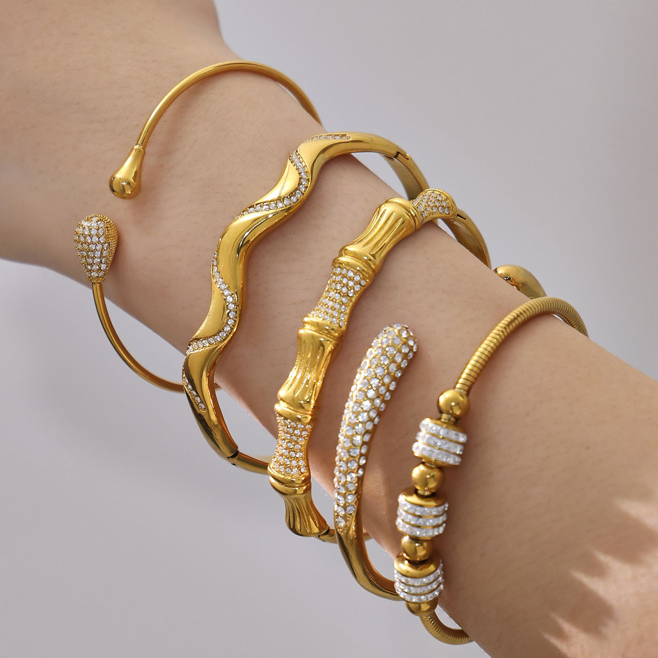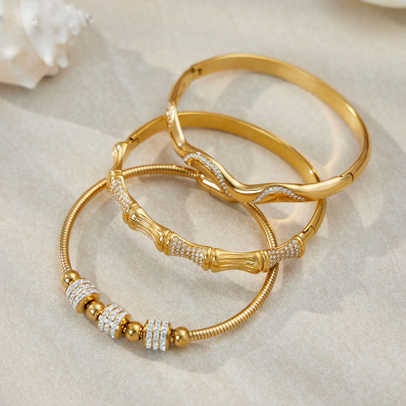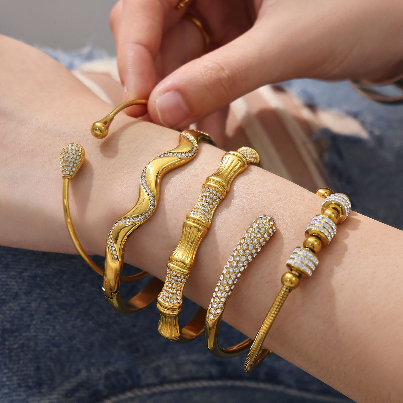 Verleihen Sie Ihrer Schmucksammlung mit unserem skulpturalen Armreif-Set einen Hauch von organischem Luxus. Inspiriert von natürlichen Formen, bestechen diese Schmuckstücke durch markante Bambusgelenk-Motive und fließende Wellensilhouetten , die allesamt mit funkelnden Pavé-Kristallen verziert sind. Ob Sie sich für strahlendes Gold oder elegantes Silber entscheiden – jeder Armreif kann einzeln für einen minimalistischen Look oder im Set für einen ausdrucksstarken, modischen Auftritt getragen werden. Diese vielseitigen Accessoires sind für die moderne Frau entworfen und verleihen jedem Outfit mühelose Eleganz.