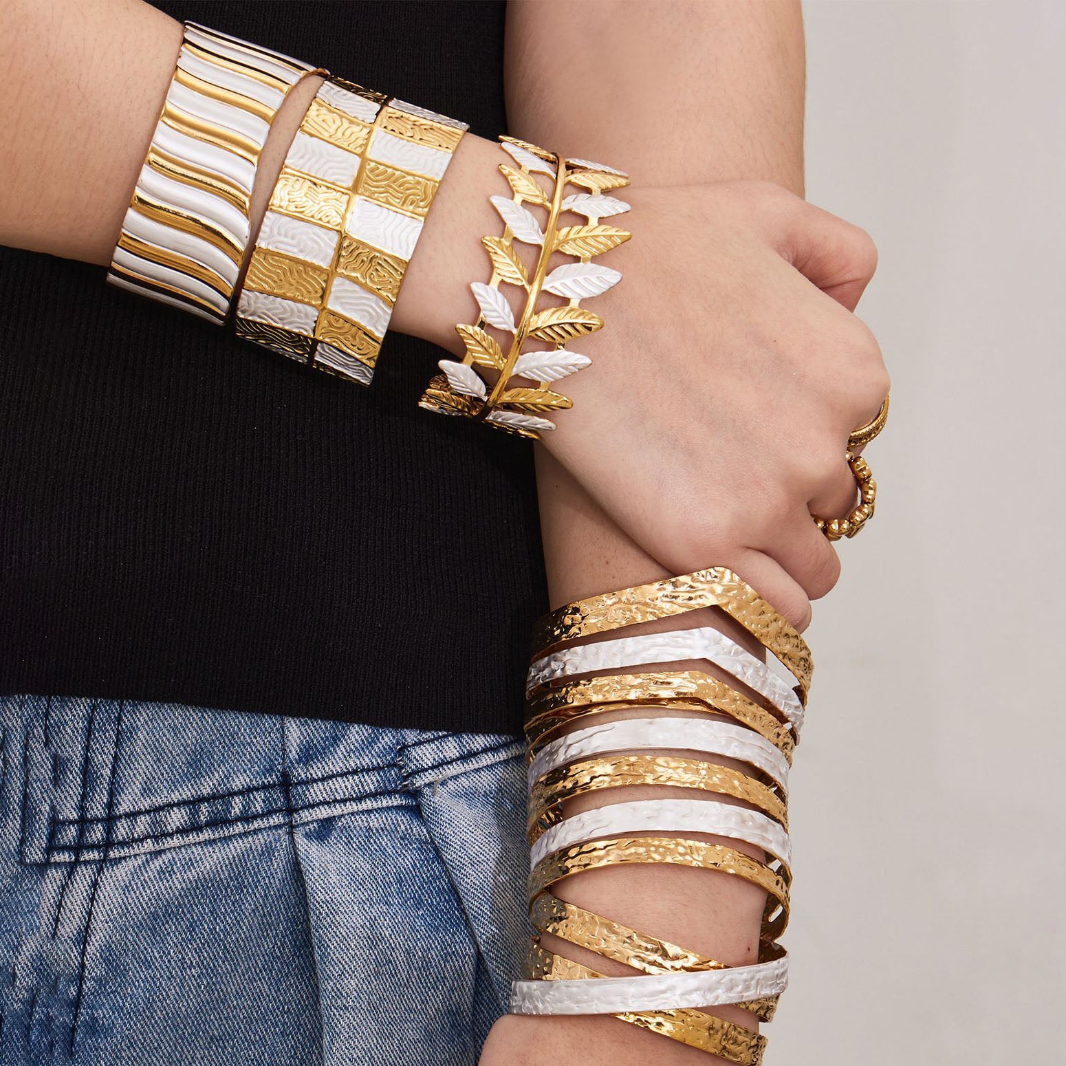 Laissez-vous séduire par l'art de nos manchettes sculpturales or et blanc . Cette collection présente une gamme variée de textures complexes – des vagues fluides aux damiers géométriques en passant par des motifs de feuilles organiques – le tout sublimé par une palette de couleurs saisissante et contrastée. Conçues pour celles et ceux qui apprécient les bijoux audacieux et architecturaux, ces pièces apportent une touche de sophistication instantanée à toutes vos tenues. Que vous superposiez les bracelets massifs bombés pour un look haute couture ou que vous portiez une seule manchette texturée comme pièce maîtresse, ces accessoires redéfinissent l'élégance contemporaine.
