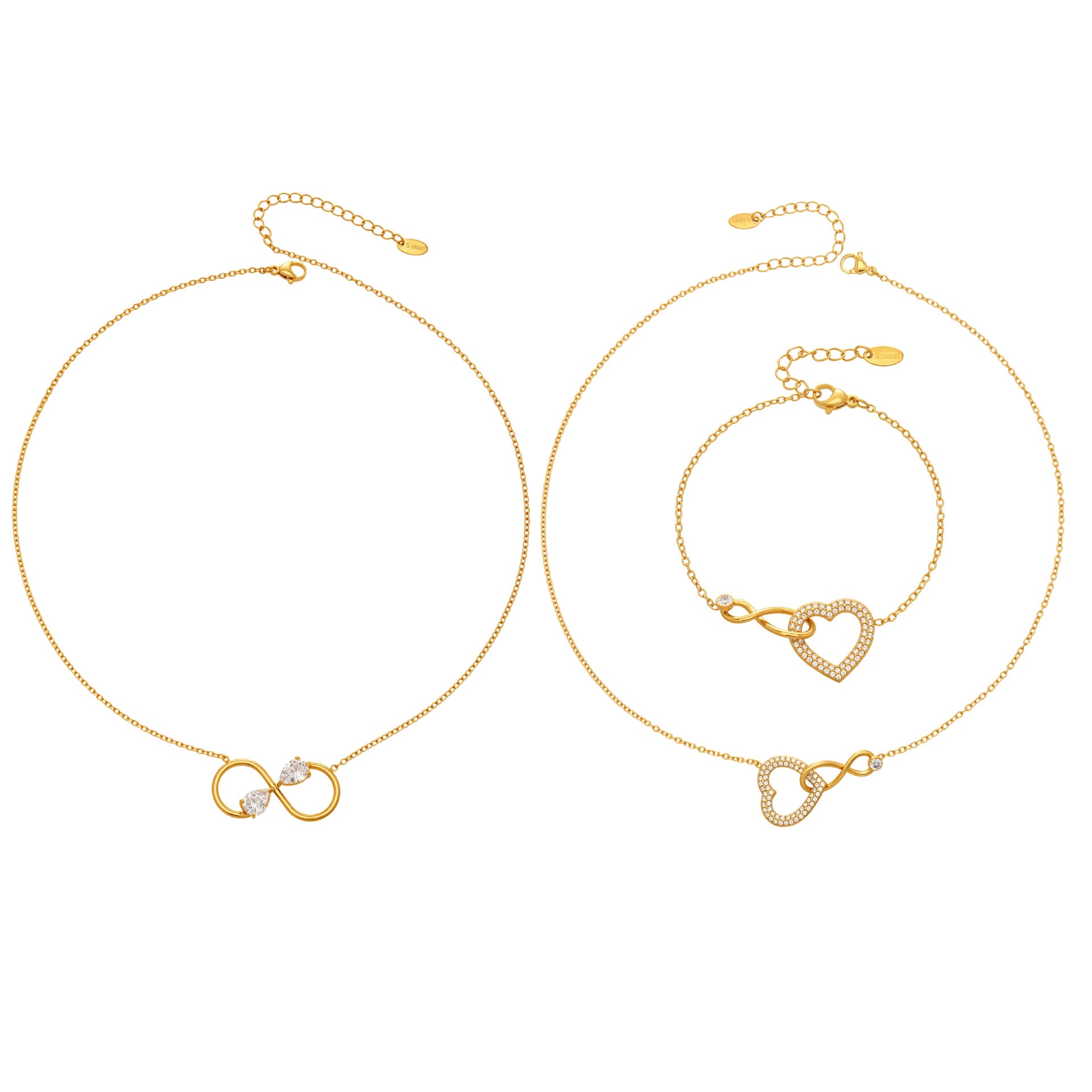 Celebrate an unbreakable bond with our Eternal Love Jewelry Collection. This exquisite set features a shimmering pavé heart intertwined with a graceful infinity symbol, representing a love that knows no limits. Crafted with a radiant gold finish and accented by sparkling cubic zirconia—including two pear-cut stones that add a touch of modern elegance—this set is perfect for layering or wearing as standout solo pieces. Whether it’s a gift for a loved one or a treat for yourself, these pieces bring timeless romance to any outfit.