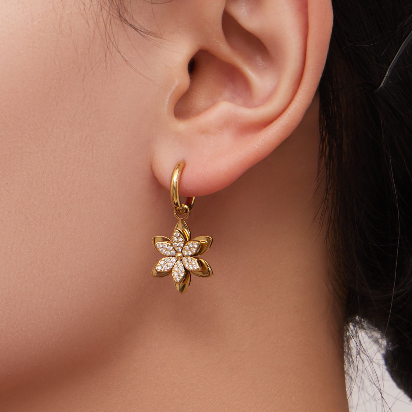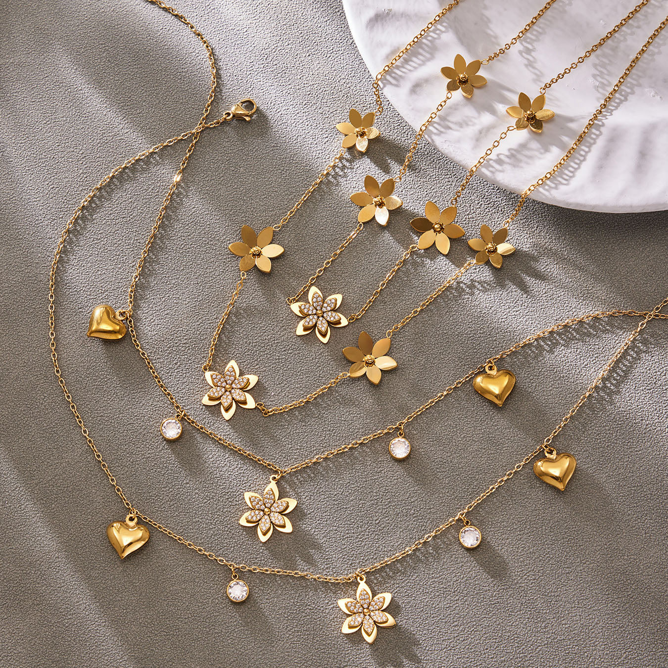 Embrace timeless elegance with our Sparkling Zircon Flower Gold Jewelry Set. This complete 6-piece collection includes a layered charm necklace, a dainty bracelet, drop earrings, an adjustable ring, and a sleek bangle. Each piece is meticulously crafted with high-quality gold plating and adorned with brilliant-cut zirconias that mimic the delicate beauty of a blooming garden. Perfect for weddings, special occasions, or elevating your daily style, this coordinated set offers effortless sophistication and a romantic floral touch to any outfit.