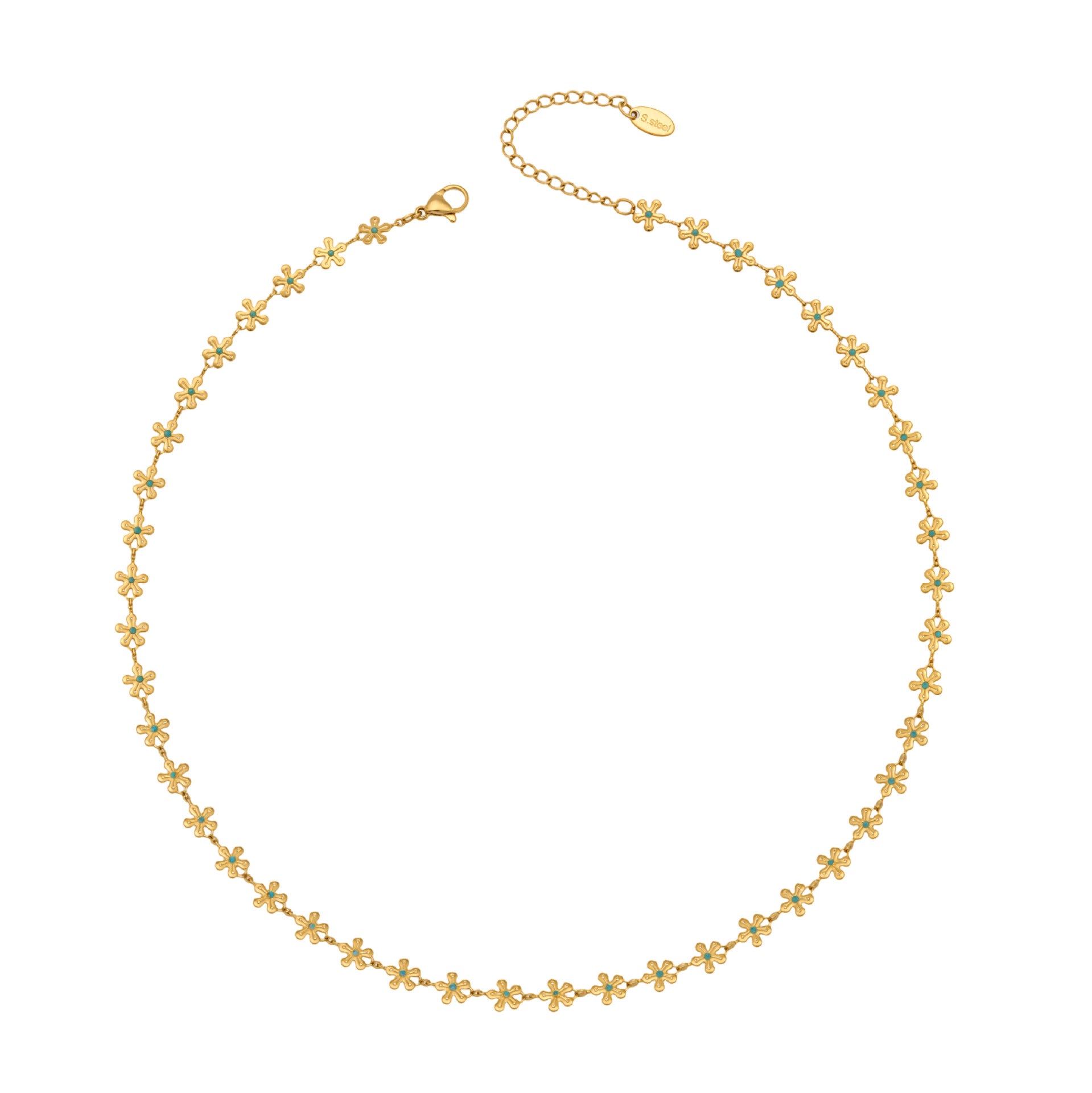 Embrace the charm of eternal spring with our Vintage Gold Daisy Choker. This exquisite piece features a delicate chain of gold-toned blossoms, each meticulously centered with a vibrant turquoise-blue stone. Its dainty design makes it perfect for layering with longer chains or wearing solo as a statement of minimalist elegance. Whether you’re heading to a sun-drenched brunch or adding a bohemian touch to your everyday look, this necklace offers timeless grace and a refreshing pop of color.